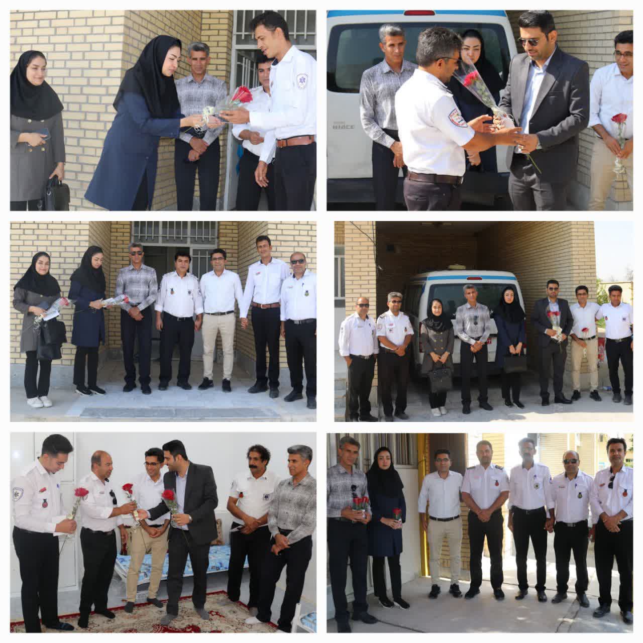 به گزارش روابط عمومی دانشکده پیراپزشکی داراب، به مناسبت روز اورژانس و فوریتهای پزشکی، دکتر "محمد رسول تقوی" رئیس شبکه بهداشت و درمان داراب، دکتر "بهاره بهادری" معاون آموزشی دانشکده پیراپزشکی و "هادی کشاورز" مسئول اورژانس شهرستان به همراه جمعی از کارکنان دانشکده پیراپزشکی داراب، باحضور در پایگاههای اورژانس حسنآباد، دولتآباد، مرکز پیام و اورژانس هوایی، از تلاشها و خدمات شبانهروزی کارکنان این حوزه قدردانی کردند.